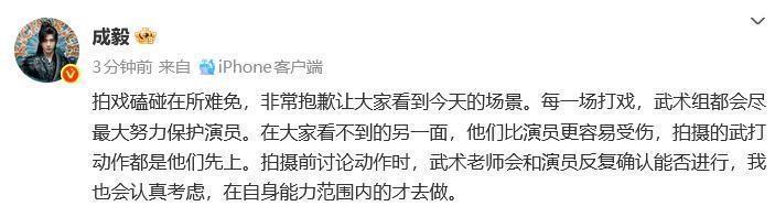 等到晚上,同一天,成毅发了条微博,说拍戏总有点磕碰,不好意思让大家见笑了。他还讲,平时武术组帮他们演员撑着,好多危险动作其实都是武行先上,有些伤他们自己受得比演员还重。每次拍这种大场面动作的时候,武术老师都会反复问演员能不能做,他也会认真衡量一下,觉得自己能上的才硬着头皮上。不少圈内人看了都感叹,这行业真不是外人想象得那么风风光光,每次群演厮杀、飞檐走壁,其实都是玩命。